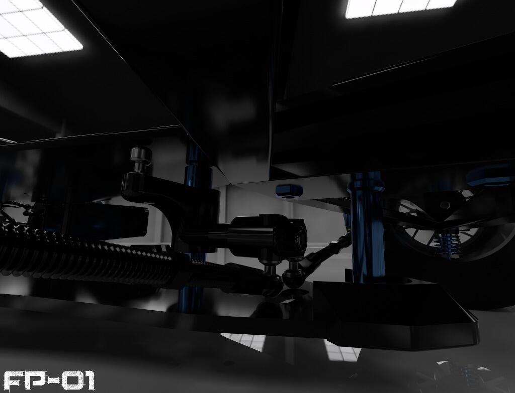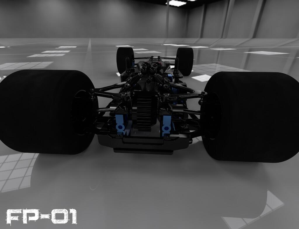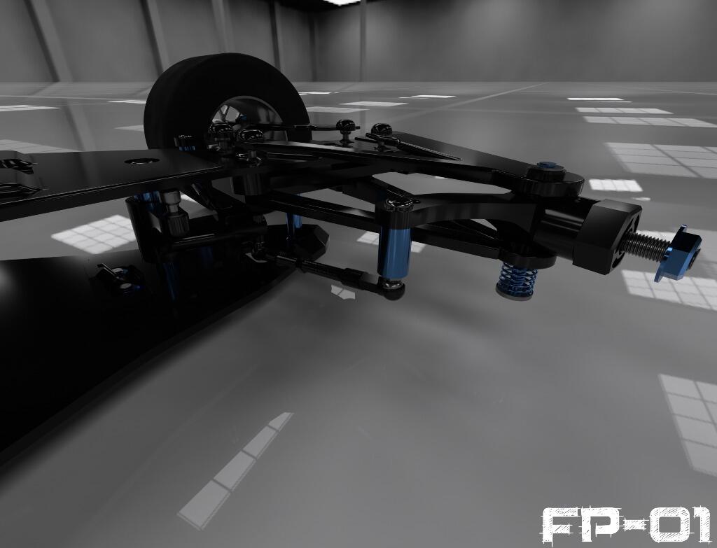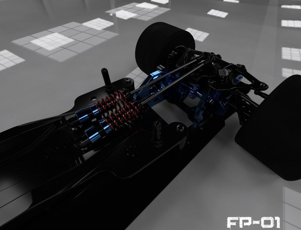 FP-01 features fully independent suspension systems. The rear end uses laydown oil filled coil spring dampeners similar to that found in today’s real F1 cars. The entire rear suspension system is fully adjustable, namely toe in/out, camber, caster, track width etc.